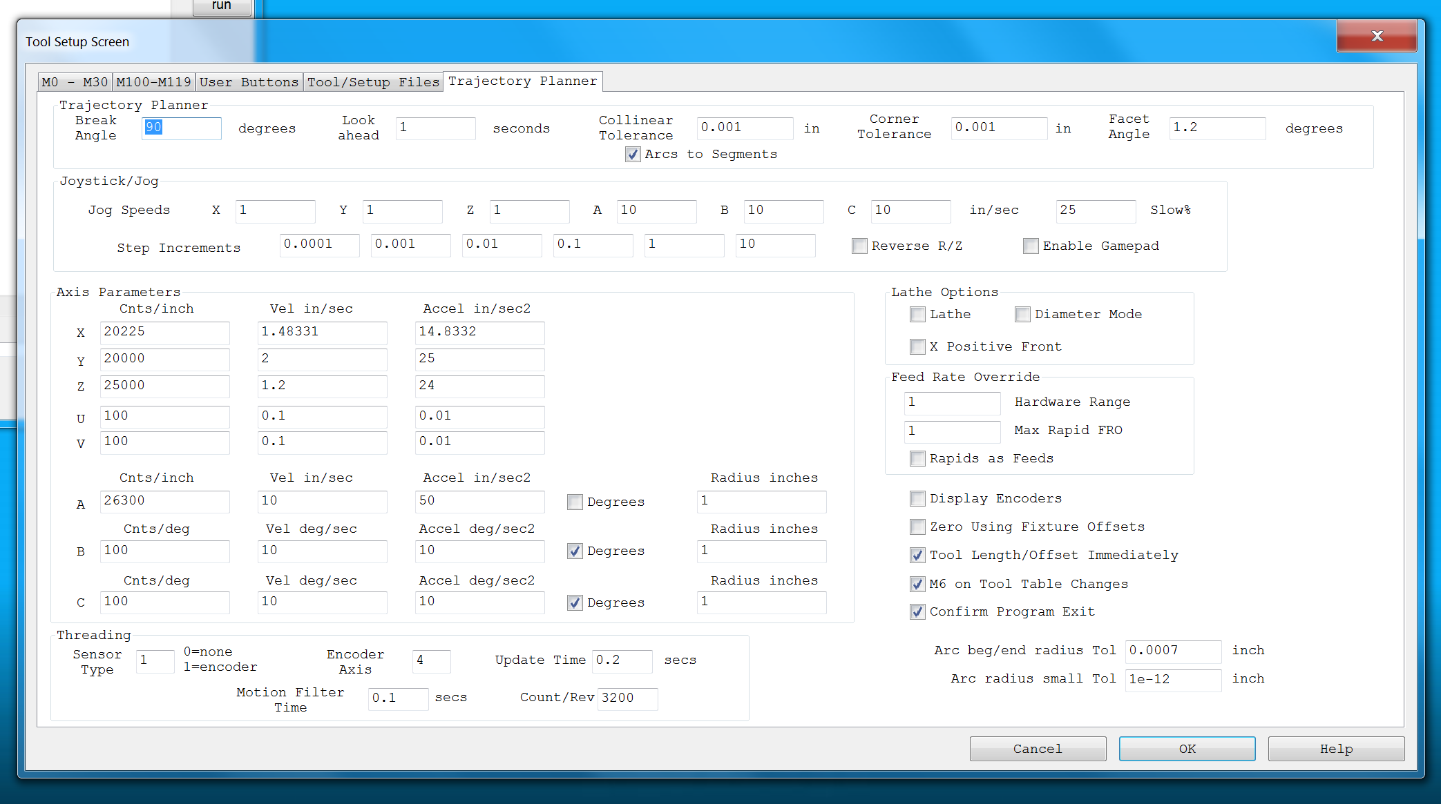 | 012 | KMotionCNC -- Tool Setup Screen "Trajectory Planner" Settings (Click on Image for larger Image) | |  |